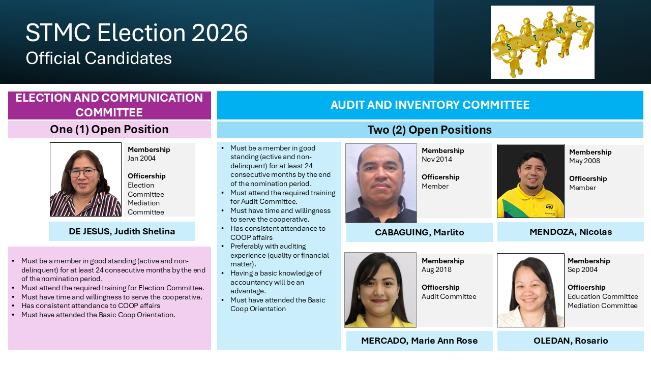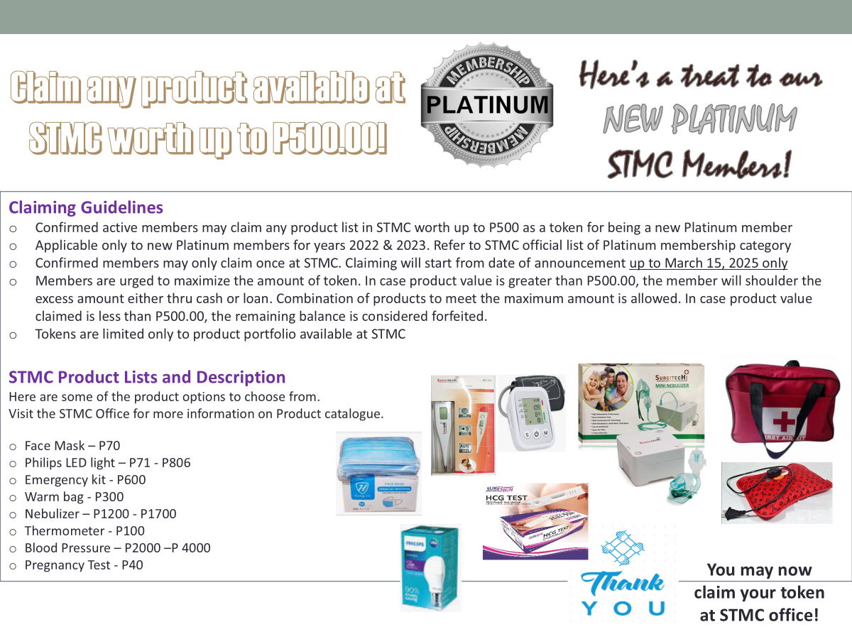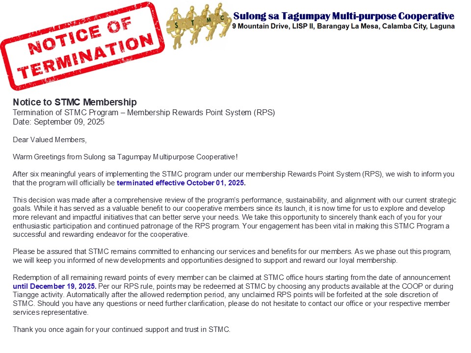 After six meaningful years of implementing the STMC program under our membership Rewards Point System (RPS), we wish to inform you that the program will officially be terminated effective October 01, 2025.
