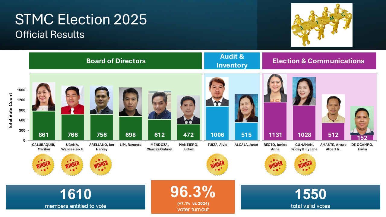 The election of new officers concluded with a voter turnout of 96.3%. The term of the winning candidates will start on 01 April 2025. Congratulations!